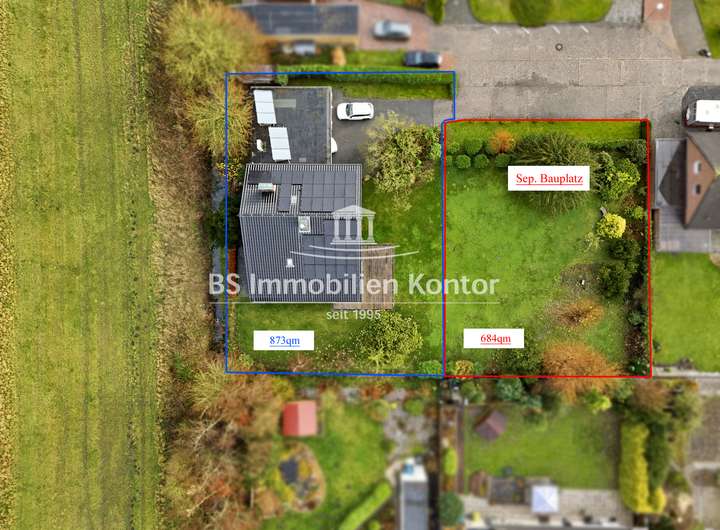 ca. 873qm (Großzügige Hofauffahrt, Gartenanlage, Garage, Gartenanlage, Süd-Terrasse, sep. Bauplatz mit 684qm kann dazu erworben werden; Haus und Hofgrundstück 873qm)