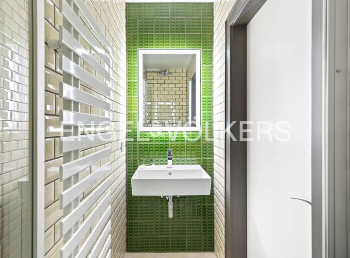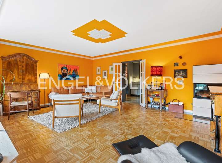Hochwertige Bodenbeläge, darunter Solnhofer Platten und Stäbchenparkett, gepaart mit modernen Fliesen, schaffen eine gemütliche und elegante Atmosphäre.