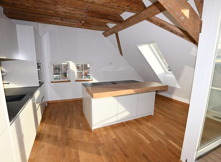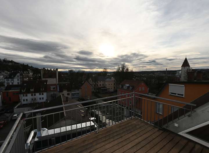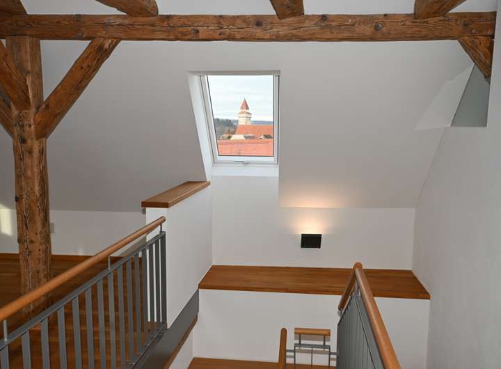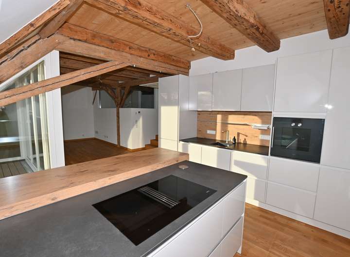 Diese außergewöhnliche Dachgeschoss-Maisonette-Wohnung verbindet modernen Wohnkomfort mit historischem Charme in bester Innenstadtlage von Ravensburg. Sie befindet sich im Dachgeschoss eines denkmalgeschützten Stadthauses in der Bachstraße, das 2016 umfassend saniert wurde. Im Erdgeschoss ist inzwischen die L’Osteria eingezogen, in den Obergeschossen befinden sich Büroflächen und im Dachgeschoss diese exklusive Wohnung. Der Zugang erfolgt komfortabel über den Aufzug direkt bis vor die Wohnungstür.