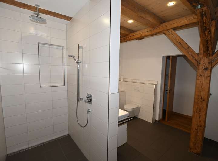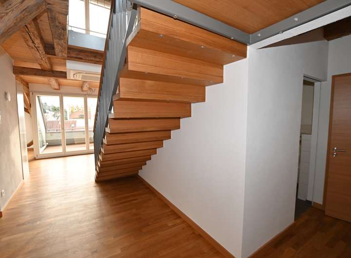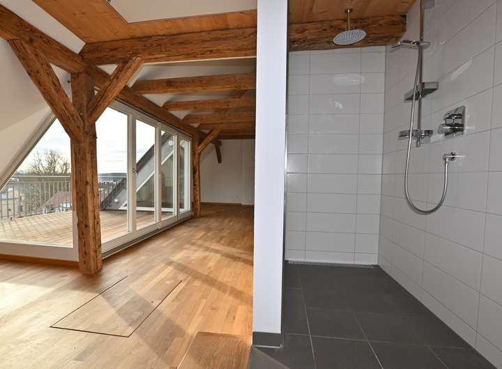 Eine sichtbare, massive Holztreppe mit Stahlwange verbindet die beiden Ebenen der Maisonette. Auf der unteren Ebene befinden sich neben dem Wohnbereich zwei weitere Zimmer mit gemütlichen Schrägen, ein Gäste-WC sowie ein großzügiges Badezimmer mit Doppelwaschtisch, WC und großer, bodengleicher Dusche. Ein besonderes Highlight ist die Teilverglasung, die den Blick in das Wohnzimmer und zur Dachloggia freigibt und so ein offenes, luftiges Raumgefühl schafft.