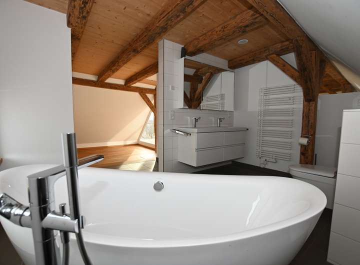 * Offenes Bad im oberen Geschoss mit Dusche und freistehender Badewanne