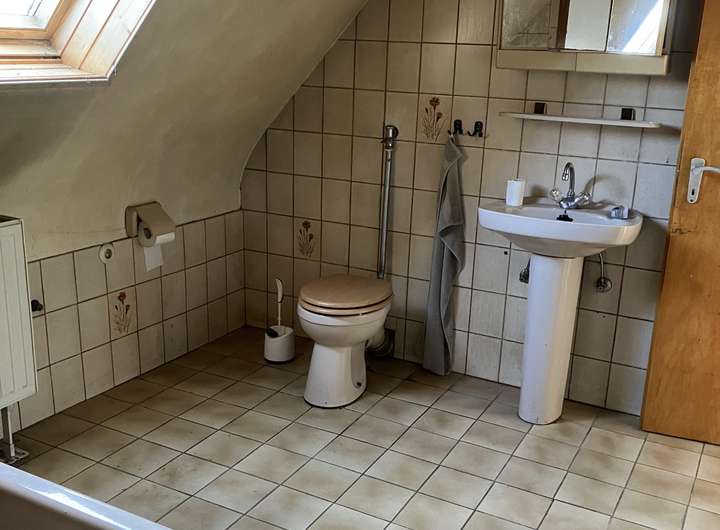Im Erdgeschoss und der darüber liegenden Etage finden sich insgesamt vier Zimmer, Küche und Bad. Das Tageslichtbad mit Badewanne komplettiert das Angebot an sanitären Einrichtungen.