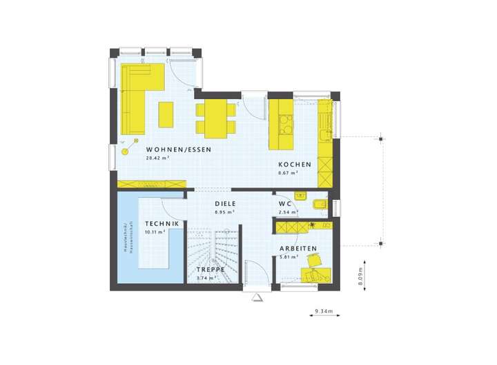 Flexible Wahl der Heiztechnik (z. B. Luft-Wasser- oder Luft-Luft-Systeme, je nach Konzept)