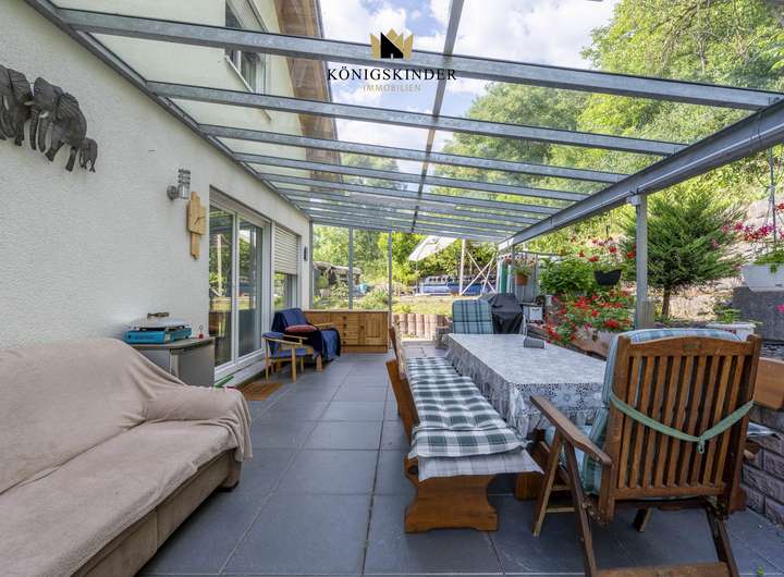 Der Außenbereich lässt ebenfalls keine Wünsche offen: Eine gemütliche Sitzgelegenheit im Garten lädt zum Verweilen ein, und ein angrenzendes Waldstück gehört ebenfalls zum Grundstück – ein echtes Paradies für Naturliebhaber.