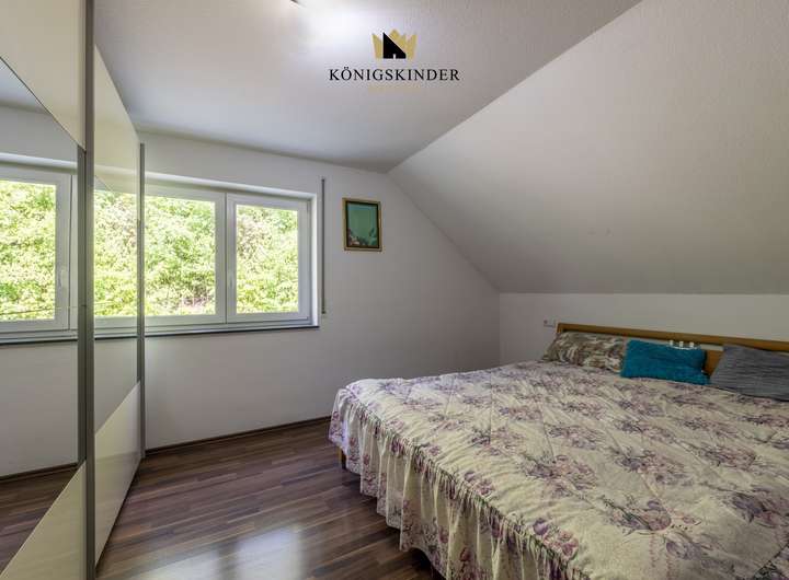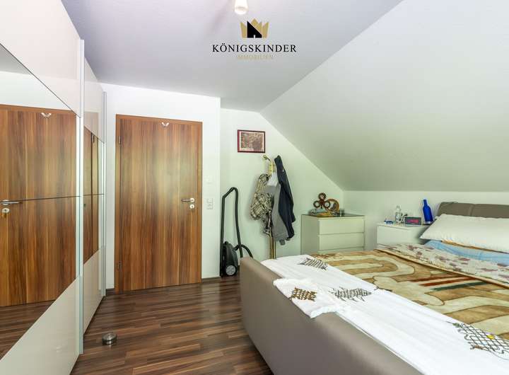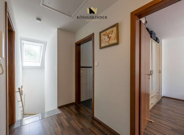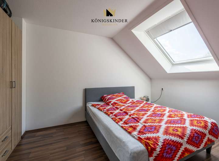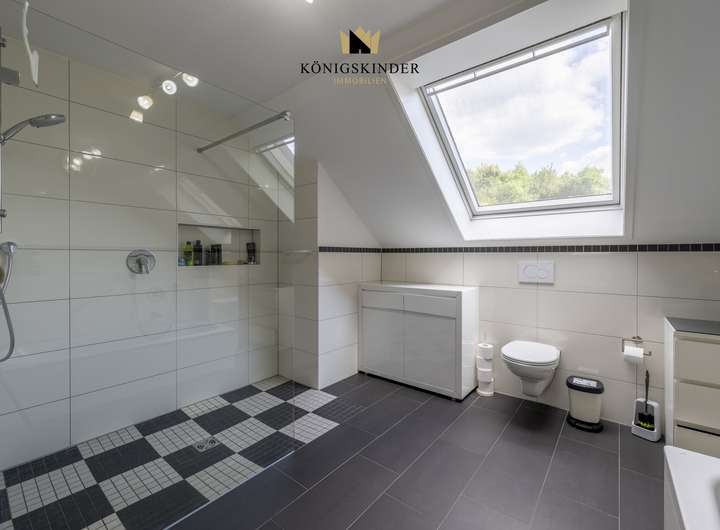 Im Dachgeschoss befinden sich insgesamt drei Schlafzimmer, die vielfältige Nutzungsmöglichkeiten bieten – ob als Kinderzimmer, Büro oder Rückzugsort. Das Badezimmer ist ein echtes Highlight: Es verfügt über eine große Dusche sowie eine komfortable Badewanne und bietet genügend Platz für die ganze Familie. Ein praktischer Wäscheabwurf sorgt für zusätzlichen Komfort im Alltag.