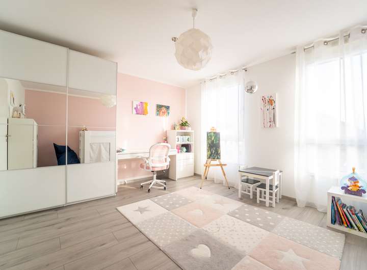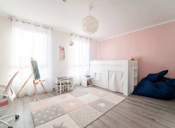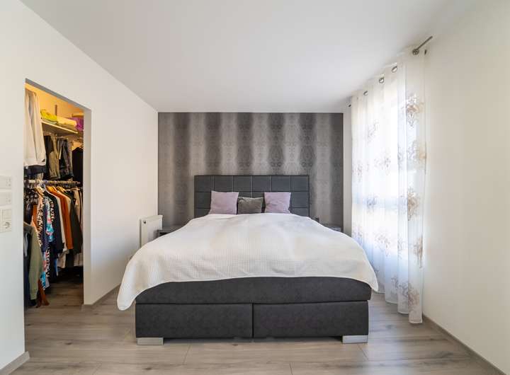Über eine Treppe gelangen Sie in das 1. Obergeschoss. Das Elternschlafzimmer verfügt über eine eigene Ankleide und sorgt für erholsamen Schlaf. Das Kinderzimmer ist hell, freundlich und bietet ausreichend Platz zum Spielen und Lernen. Ein modernes Badezimmer mit Badewanne ist von beiden Räumen über den Flur erreichbar. Einbauschränke bieten zusätzlichen Stauraum.