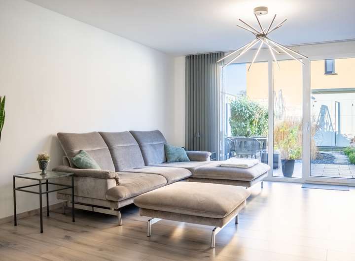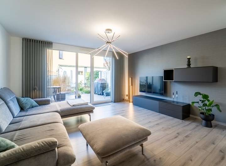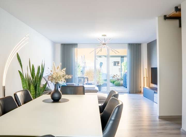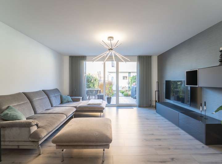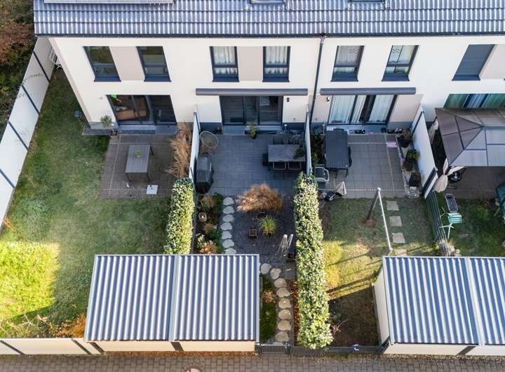 Der offene Wohn- und Essbereich im Erdgeschoss ist der Treffpunkt der ganzen Familie. Eine hochwertige Einbauküche ist im Preis inkludiert. Von hier aus erreichen Sie den stilvoll angelegten, aber pflegeleichten Garten. Die Terrasse lädt zum Grillen ein und ist mit einer Markise ausgestattet. Ein Gartenhäuschen bietet zusätzlichen Stauraum. Des Weiteren befindet sich im Erdgeschoss ein Gäste-WC.