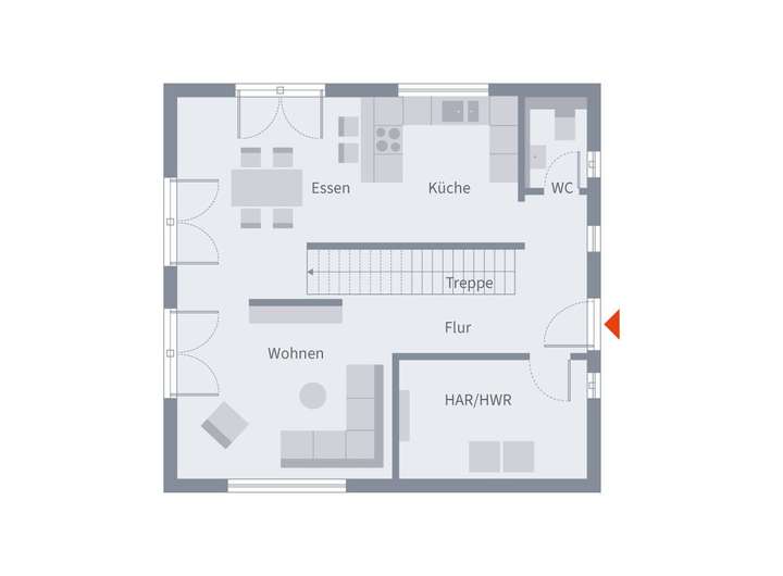 Im Erdgeschoss öffnet sich der großzügige Wohnbereich - hell, offen und lebendig. Die Treppe steht dabei im Mittelpunkt: Raumtrenner und Gestaltungselement zugleich, das dem Zuhause Charakter verleiht. Hier wird gekocht, gelacht und gelebt. Praktisch ergänzt durch ein Gäste-WC und den Hauswirtschaftsraum, der den Alltag leichter macht.