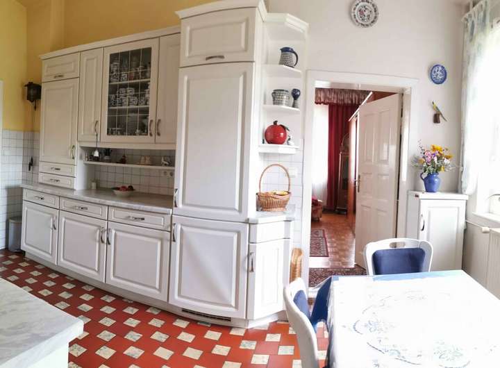 Die geräumige Küche ist mit einer Einbauküche ausgestattet und bietet viel Platz zum Kochen und Verweilen. Direkt angrenzend ist eine praktische, kleine Speisekammer. Diese ist ideal für Lebensmittelvorräte und Küchenutensilien.