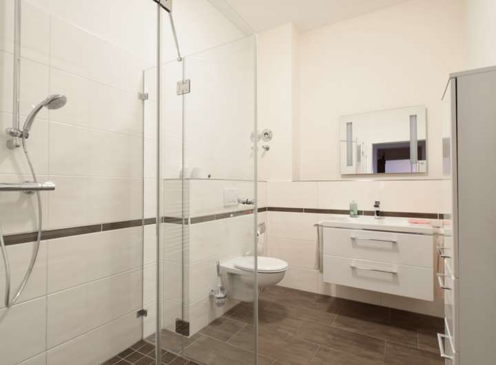 Das Duschbad ist mit hellen Wandfliesen, dunklen Bodenfliesen und weißen Sanitärobjekten ausgestattet. Die bodengleiche Dusche mit Glasabtrennung sowie ein Handtuchheizkörper lassen keinerlei Wünsche offen.