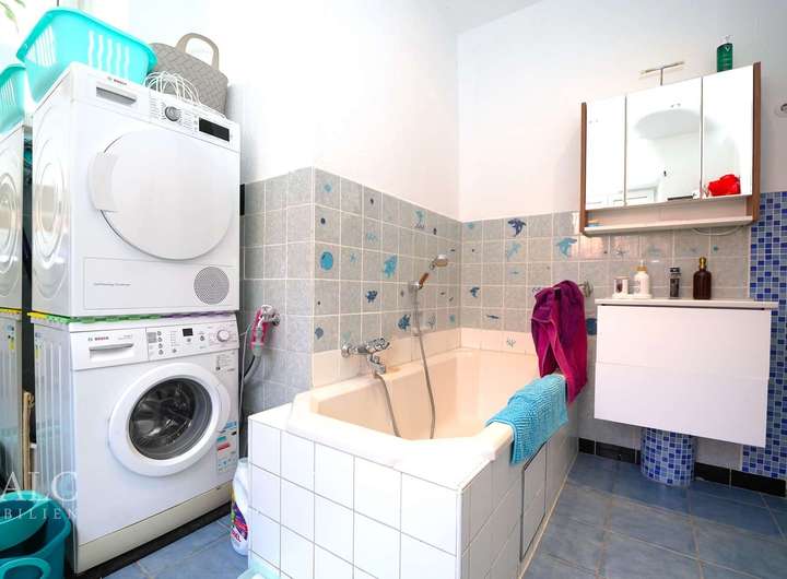 Das Tageslichtbad mit Waschmaschinenanschluss bietet genügend Platz für Ihre tägliche Morgen- und Abendroutine.