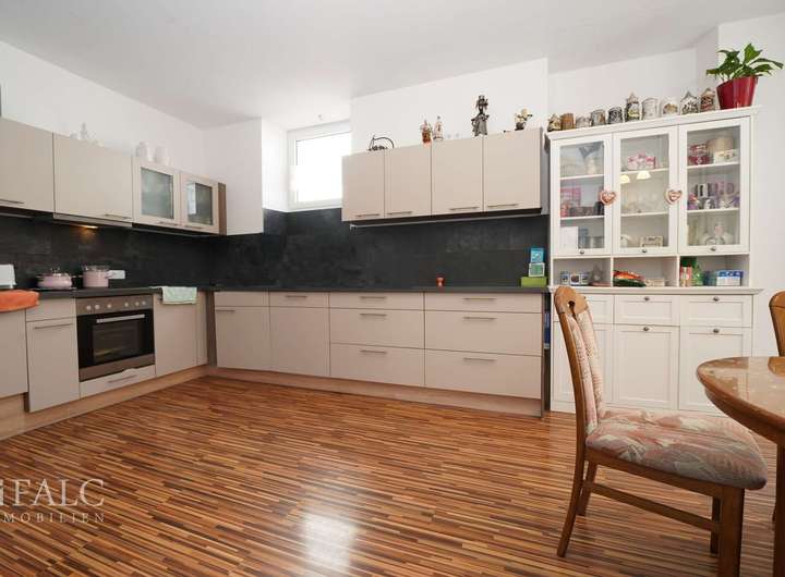Direkt angrenzend liegt die großzügige Küche. Mit über 22 m² lässt sich hier eine einladende Koch- und Esslandschaft gestalten. Genügend Raum für eine moderne Küche mit großem Esstisch und gemütlichem Beisammensein.