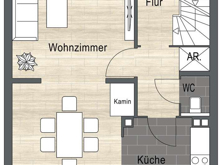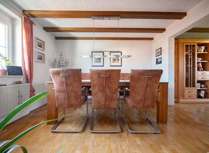 Im Obergeschoss erwartet Sie der wohnliche Mittelpunkt des Hauses. Ein gemütliches Wohnzimmer mit einem danebenliegenden Esszimmer und einer Küche, die sich ideal für gemeinsame Kochmomente eignet. Außerdem ein separates Gäste-WC und einen Flur, der die Räume harmonisch verbindet.