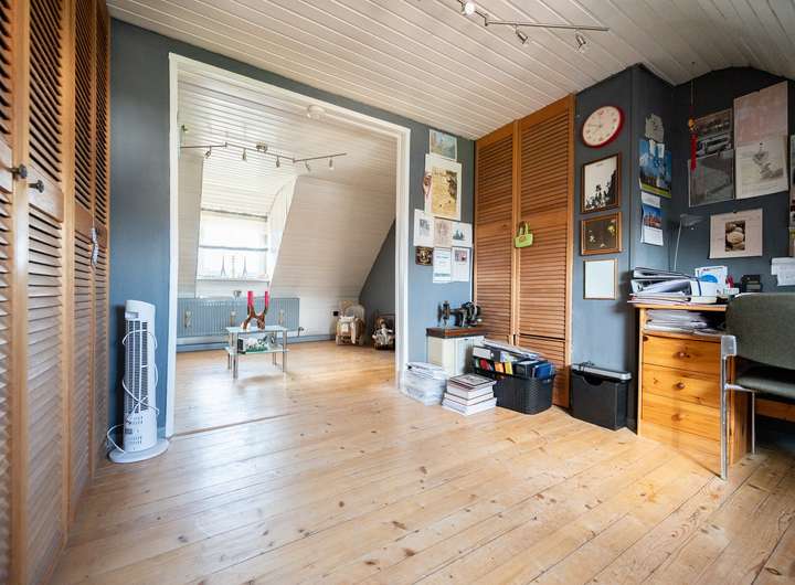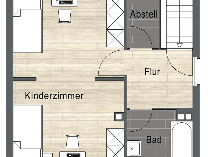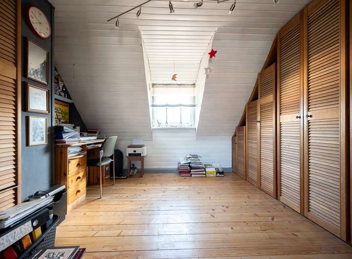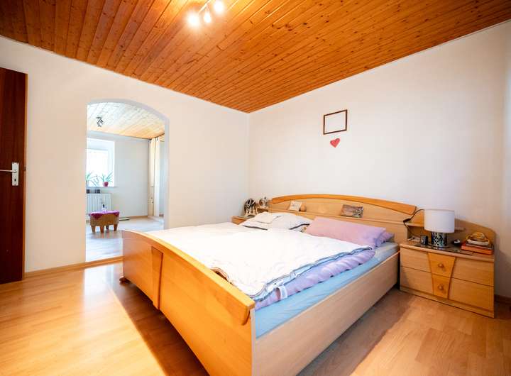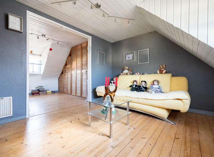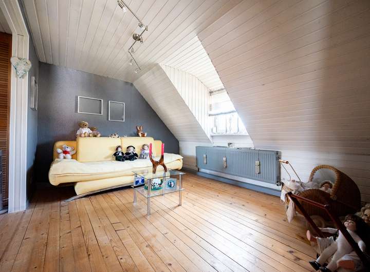 Das Dachgeschoss bietet ein weiteres Schlafzimmer, ein derzeit großzügig gehaltenes Kinderzimmer (eine Aufteilung in zwei separate Zimmer ist problemlos möglich), ein Tageslichtbad mit Badewanne und Waschbecken sowie einen Abstellraum.