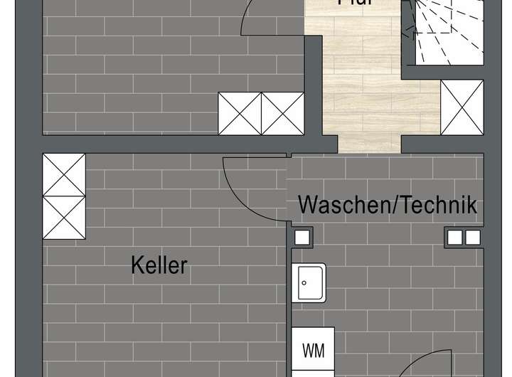 Im Untergeschoss befinden sich ein Kellerraum, eine Waschküche mit Heizraum, ein Gewölbekeller und ein Flur. Über eine Außentreppe kann der Kellerbereich zusätzlich erreicht werden.