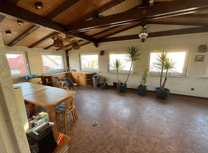 Im Jahr 1987 wurde über der Garage ein großzügiger Anbau errichtet, der einen vielseitig nutzbaren Raum bietet – ideal beispielsweise für Feiern, Hobbyaktivitäten oder als Rückzugsort.