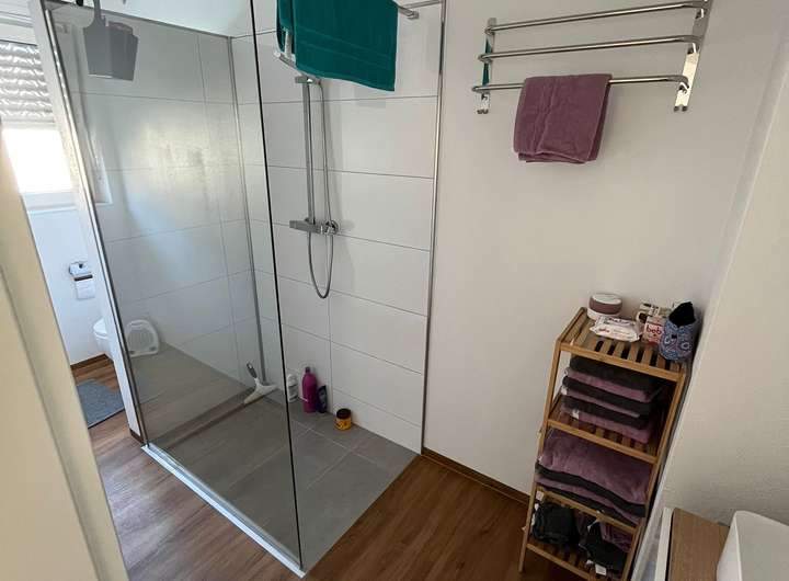 Das Badezimmer erhielt eine vollständige Erneuerung inklusive moderner, begehbarer Dusche.