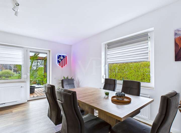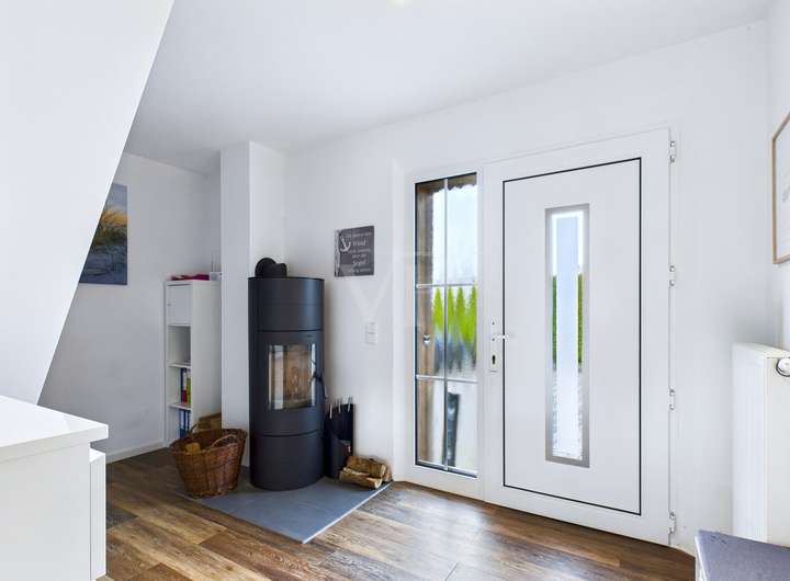 Bereits beim Betreten empfängt Sie ein helles, freundliches Entrée, von dem aus alle Räume bequem erreichbar sind. Herzstück des Hauses ist der großzügige Wohn- und Essbereich mit bodentiefen Fensterflächen, die den Raum mit Tageslicht fluten und einen harmonischen Blick in den Garten ermöglichen. Hier entstehen Wohnmomente – ob entspannte Abende, gesellige Runden oder Familienzeit.