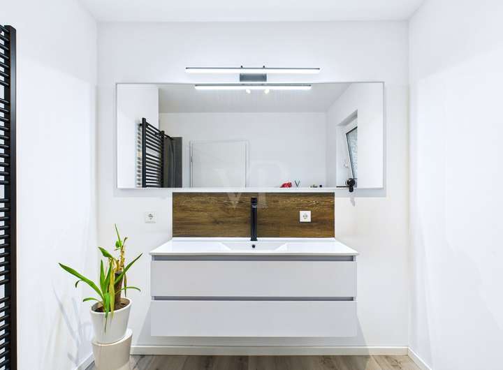 Zwei hochwertig modernisierte Badezimmer (2022) mit Dusche bzw. Badewanne bieten zeitloses Design, stilvolle Fliesen und ein harmonisches Ambiente.