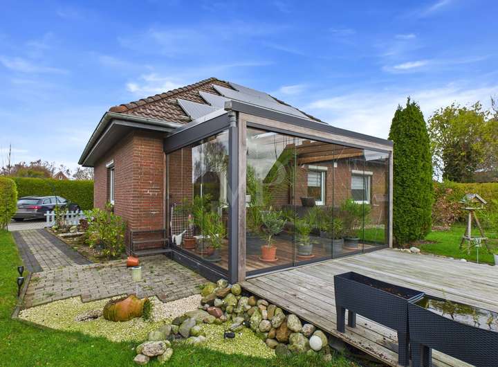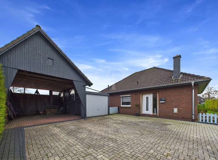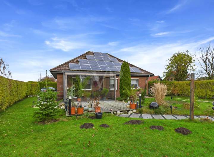 Der weitläufige Garten umgibt den Bungalow auf allen Seiten und lädt zum Entspannen, Spielen oder geselligen Beisammensein ein. Die sonnige Terrasse ist der ideale Ort für laue Sommerabende. Ein Carport sowie ein zusätzlicher Abstellraum bieten praktischen Stauraum.
