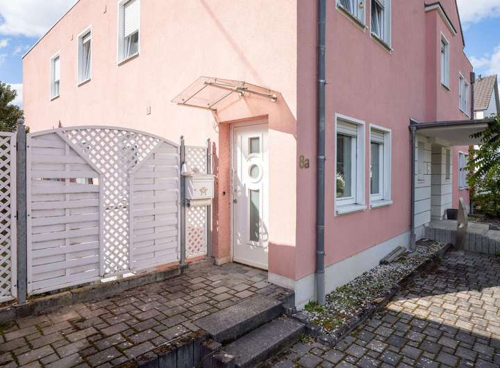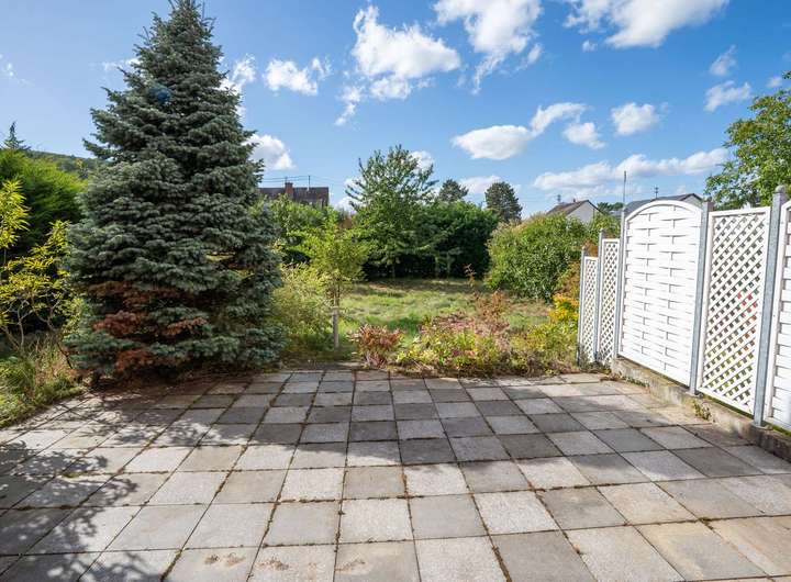 Vor dem Haus stehen zwei großzügige Stellplätze bereit, daneben eine Garage mit direktem Zugang ins Gebäude. Der weitläufige Garten mit großer Terrasse schafft einen privaten Rückzugsort für Entspannung und Freizeitgestaltung. Dank der durchdachten Bauweise erreichen Sie von hier auch die rückwärtige Seite der Garage - ideal für den Alltag.