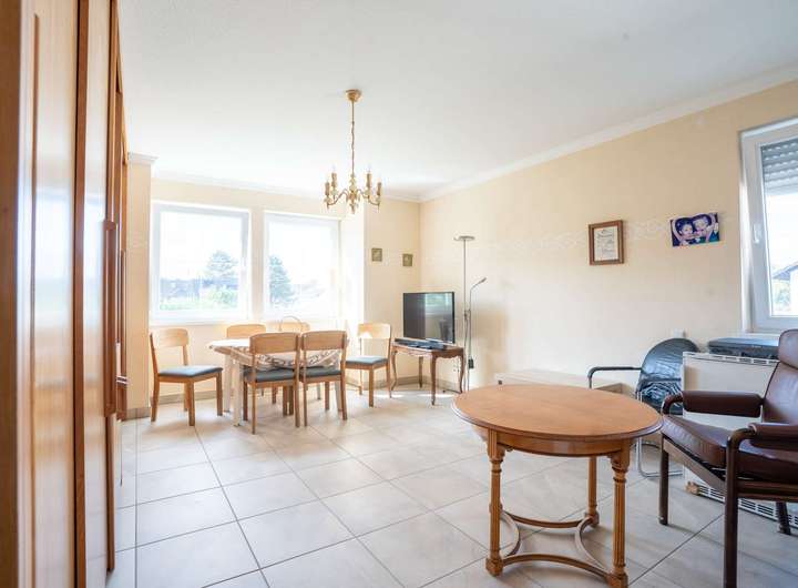 Die Einliegerwohnung, erstreckt sich auf 77 qm der Gesamtwohnfläche und bildet einen eigenständigen Bereich und eignet sich ideal für Familienmitglieder, Gäste oder eine separate Nutzung. Sie verfügt über einen kleinen Flur, ein modernes Duschbad und ein Schlafzimmer im Erdgeschoss. Im Untergeschoss stehen eine Küche mit Essbereich, ein Wohnzimmer mit eigener Terrasse sowie ein weiteres Zimmer zur Verfügung - auch hier wurden Fliesen bereits erneuert.