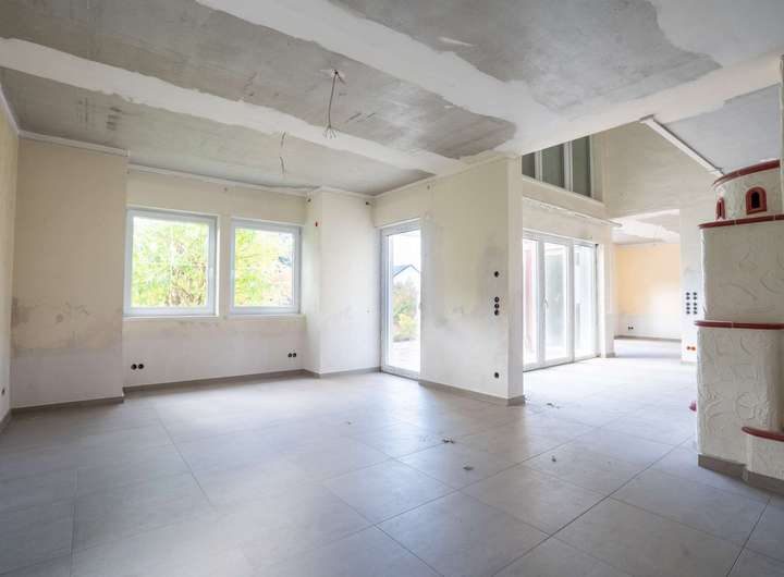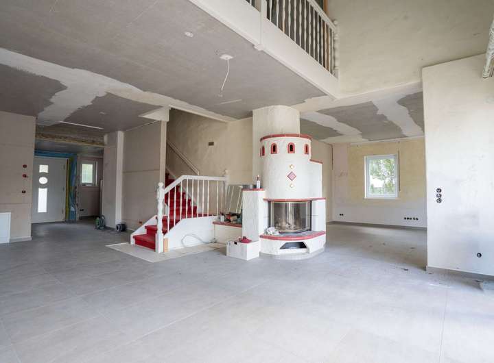Im Erdgeschoss empfängt Sie ein lichtdurchfluteter, offener Wohnbereich, der Großzügigkeit und Wohnqualität miteinander verbindet. Ein modernes Duschbad und ein flexibel nutzbares Zimmer - etwa als Büro oder Gästezimmer - ergänzen das Raumangebot. Die Küche mit angrenzendem Essbereich und großflächiger Glasfront zur Terrasse bildet das kommunikative Herzstück des Hauses. Ein weiterer Wohnbereich mit Kaminanschluss schafft den perfekten Rahmen für gemütliche Abende.