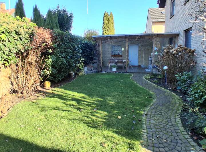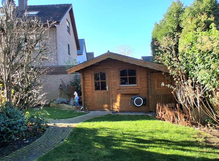 Der großzügige private Garten mit Außenterrasse, Pergola und Gartenhäuschen erweitert den Wohnraum ins Freie und lädt zu entspannten Stunden sowie geselligen Abenden ein.