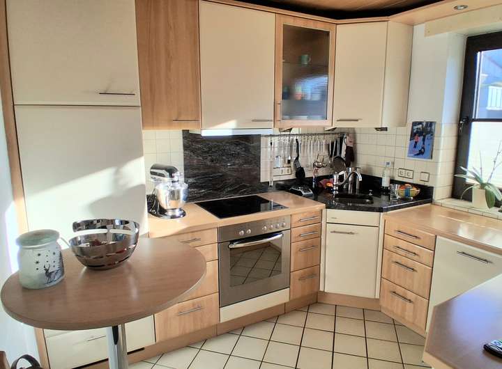 Die vorhandene Einbauküche fügt sich harmonisch in das hochwertige Gesamtbild der Wohnung ein.