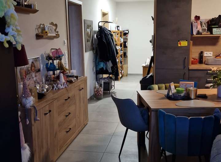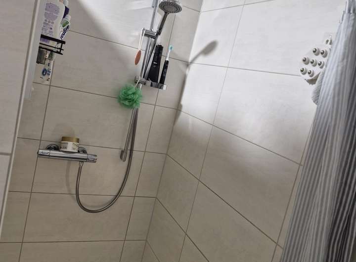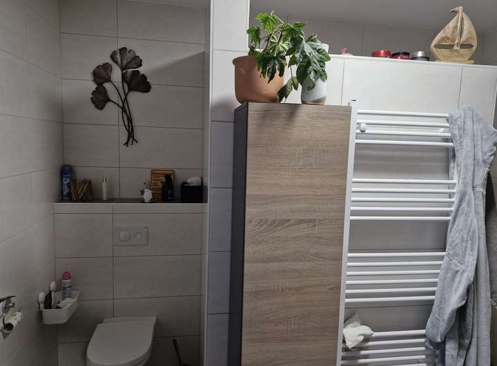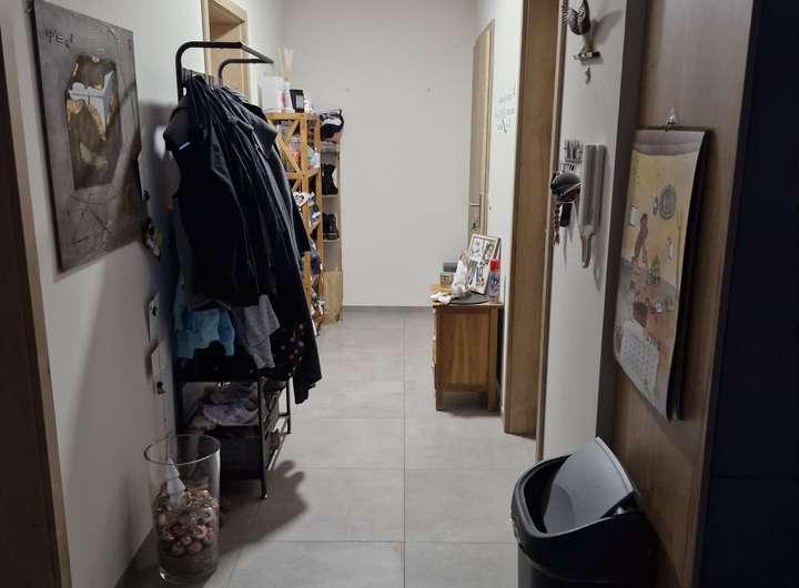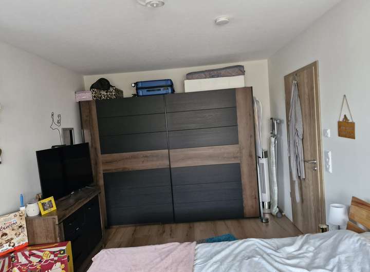 In der gesamten Wohnung befinden sich Fliesen, außer in den Schlafräumen Laminat.