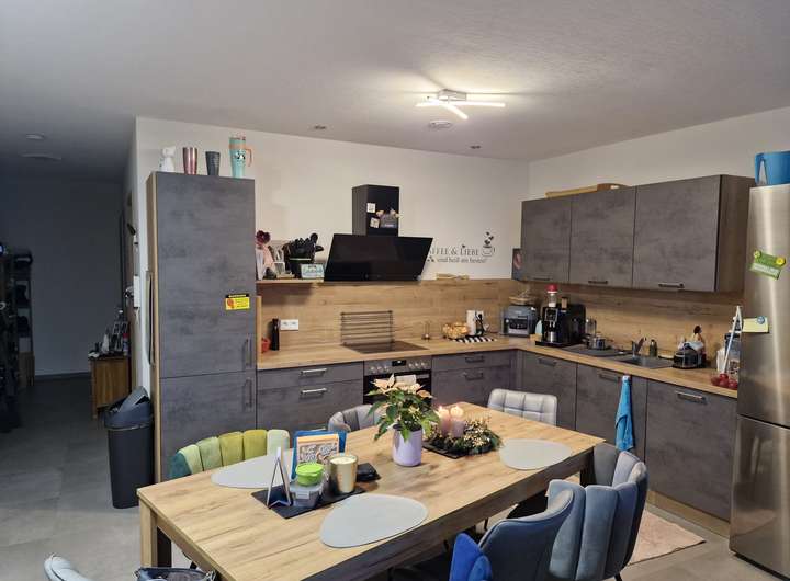 Die große Einbauküche, mit viel und gut beleuchteter Arbeitsfläche, beinhaltet neben den Standartgeräten wie Ceranfeld, Abzugshaube und Spüle eine Spülmaschine und einen Kühlschrank mit Kühl-/Gefrierkombination.
