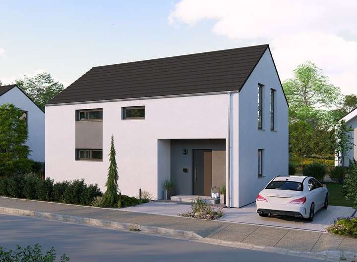 Auf zwei Ebenen vereint dieses Haus durchdachte Planung mit markantem Design. Die Fassade spielt mit Symmetrien und verleiht dem Baukörper eine besondere Präsenz, während der überdachte Eingang einen geschützten, einladenden Empfang schafft. Im Erdgeschoss öffnet sich die Diele zu einer klar gegliederten Raumfolge: Hauswirtschaftsraum und Gäste-WC sind dezent platziert, ein separates Büro bietet Rückzug für konzentriertes Arbeiten. Herzstück ist der offene Wohn-, Ess und Kochbereich, in dem großzügige Flächen und fließende Übergänge das Miteinander zum Erlebnis machen. Im Dachgeschoss sorgt die clevere Grundrissgestaltung für große Räume und einen bewusst klein gehaltenen Flur. Zwei helle Kinderzimmer, ein Elternschlafzimmer und ein komfortables Bad mit Wanne und Dusche schaffen Platz für alle Lebensphasen. Mit 149 m² bietet dieses Haus Raumqualität, die inspiriert - funktional, großzügig und im Detail präzise gestaltet.