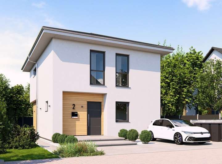Schlichte Eleganz und ein durchdachtes Raumkonzept verleihen diesem Einfamilienhaus seine besondere Ausstrahlung. Die klare Linienführung der Architektur wird von einer zweifarbigen Fassadengestaltung betont, die Tiefe und Charakter schenkt. Im Inneren setzt sich diese Klarheit fort: Das Erdgeschoss öffnet sich zu einem lichtdurchfluteten Wohn-, Ess- und Kochbereich, der fließend in den Garten übergeht - ein Ort für lebendige Begegnungen und stille Augenblicke. Hauswirtschaftsraum und Gäste-WC sind dezent abgetrennt und sorgen für praktische Funktionalität. Von der großzügigen Diele führt eine Treppe ins Dachgeschoss, wo der Raum optimal genutzt ist: Ein helles Kinderzimmer, ein Elternschlafzimmer, ein Büro und ein komfortables Bad mit Wanne, Dusche und WC schaffen ein harmonisches Wohnumfeld. Auf rund 130 m² entsteht so ein Zuhause, das beständig Freude schenkt und Generationen verbindet.