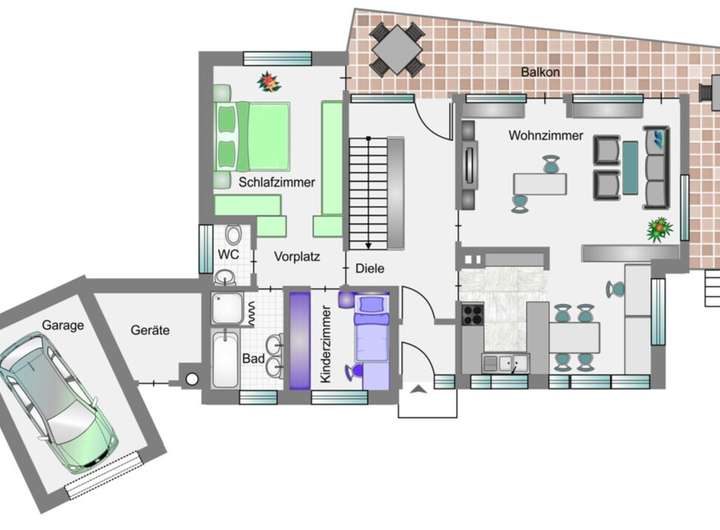 Im Erdgeschoss befinden sich ein großes Wohn- und Esszimmer mit Kachelofen und offener Küche sowie ein großer Balkon mit Südost-Ausrichtung. Des Weiteren gibt es im Erdgeschoss ein Elternschlafzimmer, ein Kinderzimmer, das Hauptbadezimmer und ein Gäste-WC.