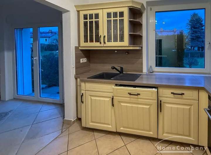 Im Erdgeschoss befindet sich die Küche inklusive Einbauküche sowie das Wohn- und Esszimmer. Vom Esszimmer aus ist die Terrasse begehbar.