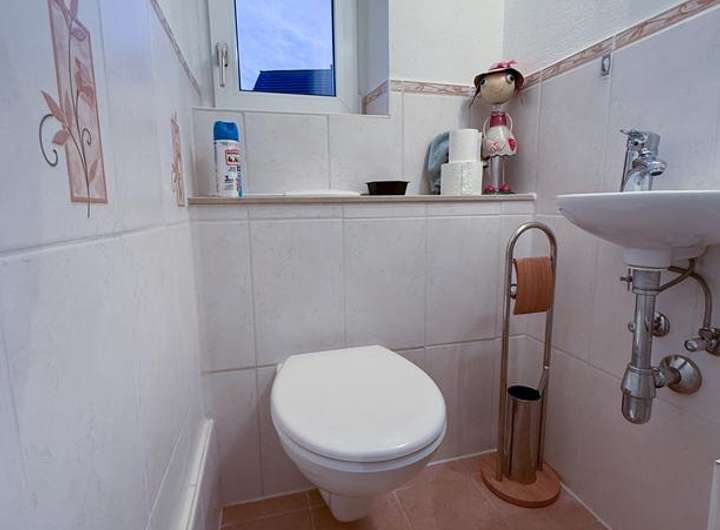 An der Treppe zum Obegeschoß ist ein kleines Gäste-WC plaziert.