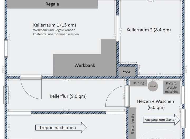 Der Nutzfläche im Keller beträgt ca. 38 m², die Gartengeräte, die Werkbank und die Regale im Keller können kostenfrei übernommen werden