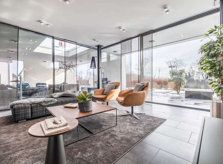 Ein Glasgeländer sorgt dafür, dass auch hier oben Wohnen und Natur miteinander verschmelzen. Ein Weitblick ist auf diese Weise problemlos möglich - während man selbst auf dieser Dachterrasse ausreichend Platz hat, um sich frei von Blicken zu sonnen, zu lesen oder einfach nur das Leben zu genießen. Ein Haus, das rundum begeistert.
