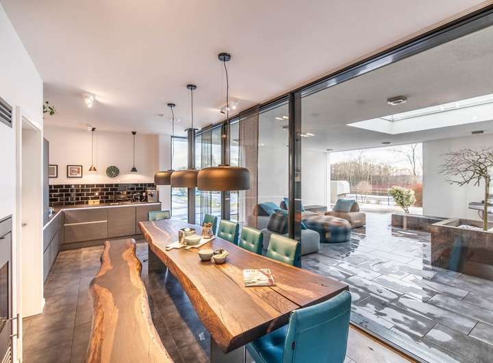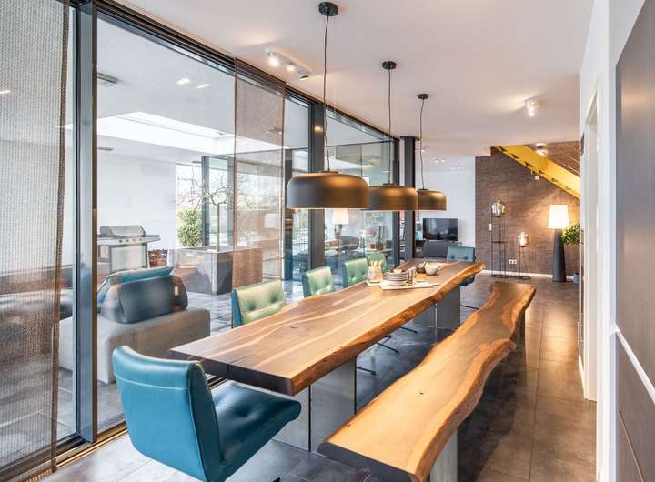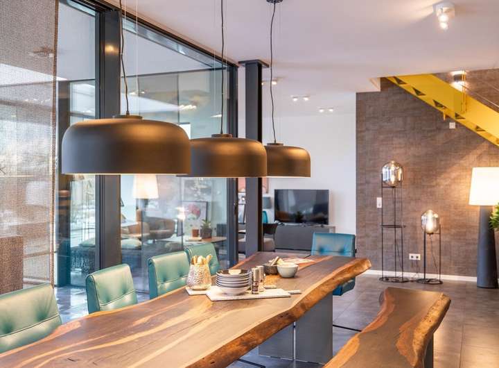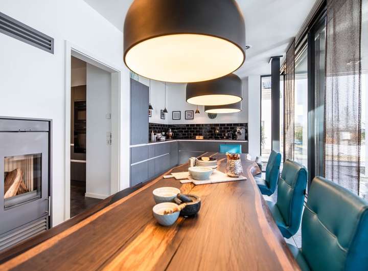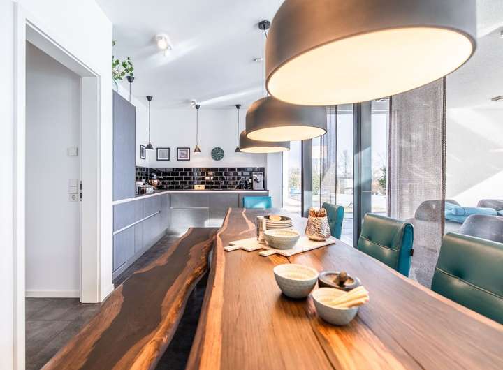 Hier werden Wohnträume wahr! Dieses Gefühl entsteht bereits beim Betreten der Diele, die nahtlos in den großen Wohn-Ess-Koch-Bereich und gefühlt auch in die Natur übergeht. Hier werden Endorphine ausgeschüttet, hier werden Wohnträume wahr. Und hier wird deutlich, dass sich eine beeindruckende Optik und ein hoher Wohnkomfort keinesfalls ausschließen müssen. So schließen sich beispielsweise direkt an die Küche ein Vorratsraum sowie ein großer Hauswirtschaftsraum an. Ebenfalls im Erdgeschoss: ein Gäste-WC mit Dusche sowie ein weiteres Zimmer, das als Büro oder als Schlafstätte für Gäste genutzt werden kann.