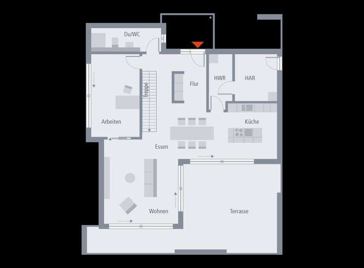 Im hellen Wohnraum, der zugleich das Herzstück des Erdgeschosses ist, führt eine Treppe ins Obergeschoss. Dank des Flachdaches kann dieses ohne Einschränkungen im Hinblick auf die Stockhöhe genutzt werden. Doch das ist nur einer der zahlreichen Vorteile, die in der ersten Etage des Musterhaus Wuppertal zum Tragen kommen. Auf dieser Ebene befinden sich drei Schlafräume - zwei Kinderzimmer und ein Elternzimmer mit sich anschließendem Ankleideraum - ein großes Bad sowie eine separate Toilette. Hier befindet sich aber vor allem das ohne Frage absolute Highlight des Musterhaus Wuppertal: Hier dominiert die über Eck laufende, 58 qm große Dachterrasse, die von allen drei Schlafzimmern direkt zugänglich ist.