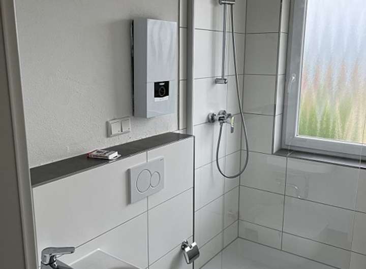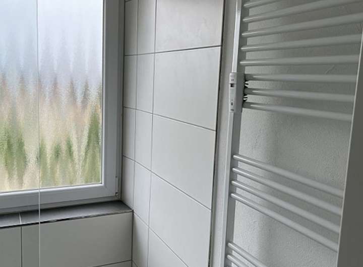 - Bad mit Fenster (neu in 2022): Dusche mit Glaswand, WC, HWB, verschiedene Höhen gefließt (weiß), Bodenfliesen in anthrazit, Handtuchheizkörper, eigener Wasserzähler