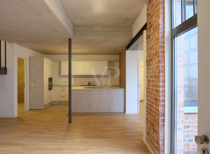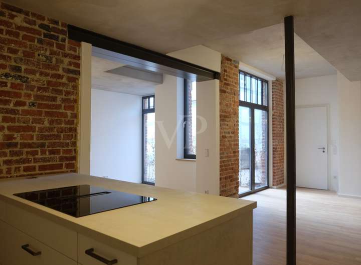 Auf ca. 163 m² Wohnfläche, verteilt auf 3,5 Zimmer, entfaltet sich ein offenes, lichtdurchflutetes Raumkonzept. Sichtbares Mauerwerk, industrielle Fenster und beeindruckende Deckenhöhen verleihen der Wohnung ihren authentischen Loftcharakter. Die großen Fensterfronten sorgen für reichlich Lichteinfall und unterstreichen das helle, offene Raumgefühl.