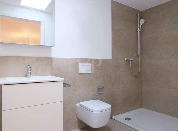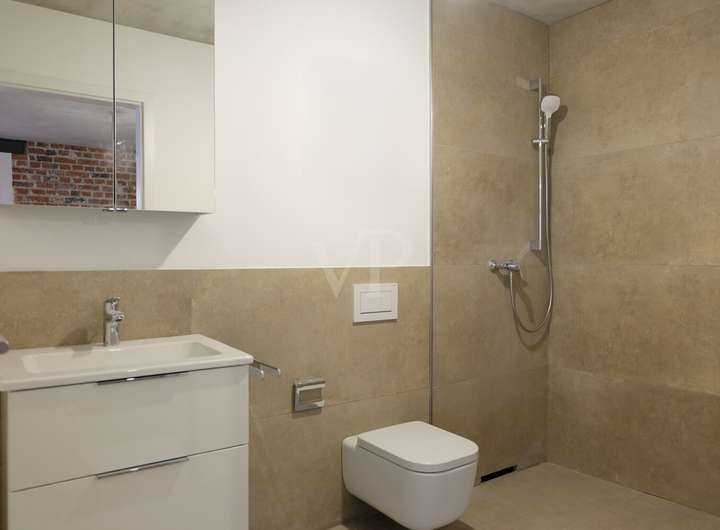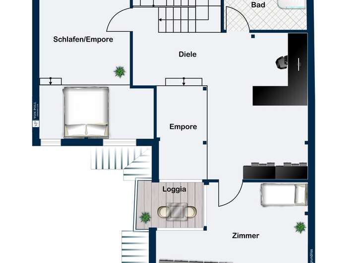 Über eine stilvolle Treppe erreichen Sie die obere Ebene mit offener Galerie, die dem Raum besondere Tiefe verleiht. Zwei Zimmer bieten Rückzugsbereiche, eines mit Podest, das andere beeindruckt durch eine dreiseitige Glasfront und direktem Zugang zur Loggia. Ein modern ausgestattetes Badezimmer mit Walk-in-Dusche rundet die private Rückzugszone stilvoll ab.