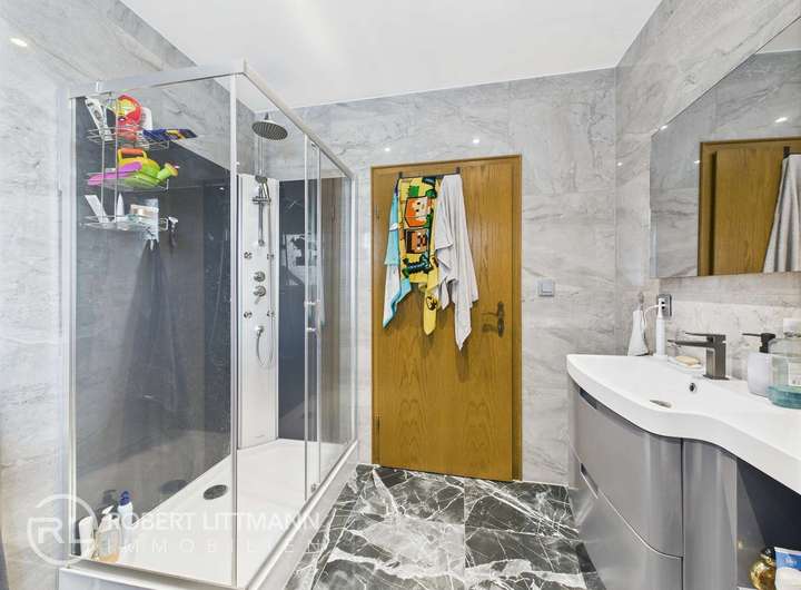 Im Erdgeschoss erwartet Sie eine durchdachte und funktionale Raumaufteilung: Ein großzügiges Wohnzimmer mit direktem Zugang zur sonnigen Terrasse, eine gemütliche Küche mit Essbereich, zwei Schlafzimmer, zwei Kinderzimmer, ein super modernes Bad mit Dusche, sowie ein separates Gäste-WC und ein Hauswirtschaftsraum.
