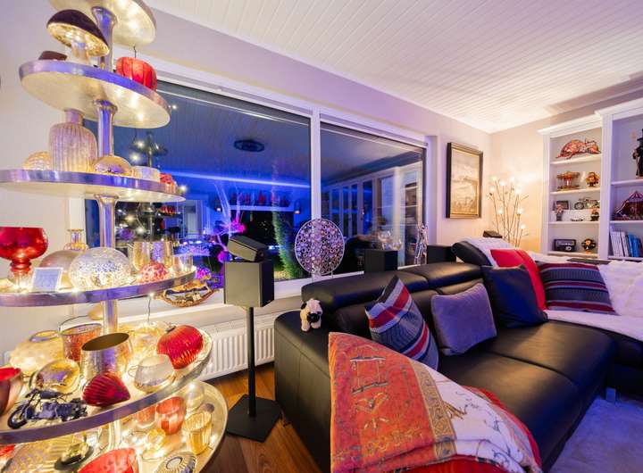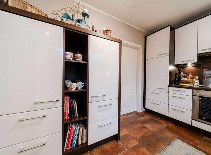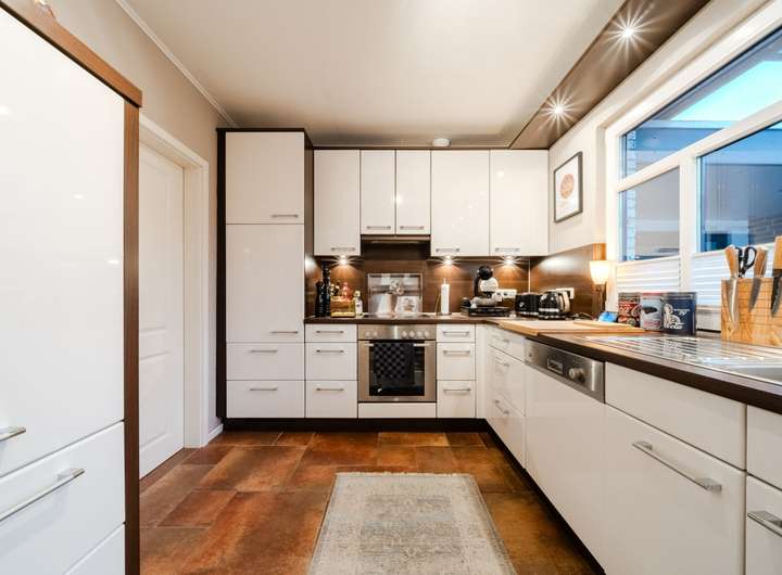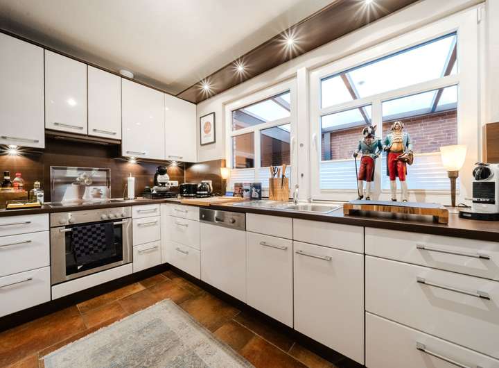 Die separate Küche verfügt über einen direkten Zugang zum Hauswirtschaftsraum. Hinter der gegenüberliegenden Theke befindet sich der lichtdurchflutete Sommergarten, der Sommer- wie Wintertage zu einem Erlebnis macht. Von hier aus blicken Sie in den Garten und auf das am Haus entlang fließende Hintertief.