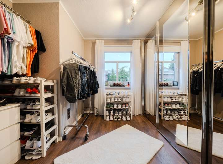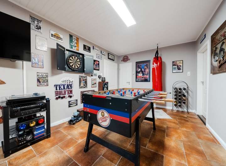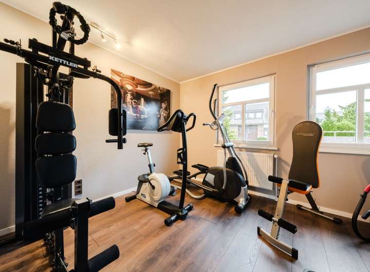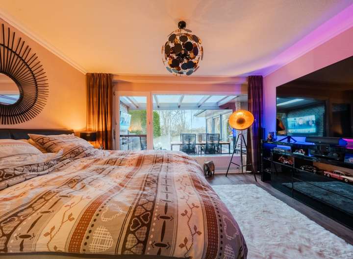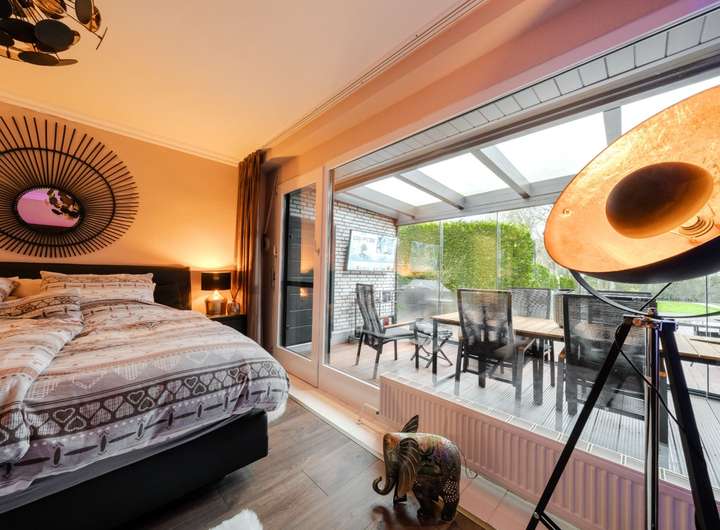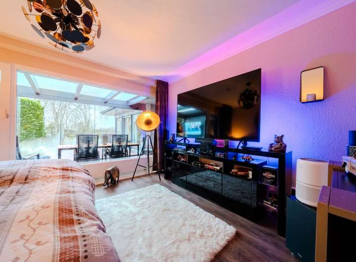 Im privaten Bereich des Hauses befinden sich das Hauptbadezimmer, ein möglicher Kinder- oder Fitnessraum, ein ca. 9 m² großes Ankleidezimmer sowie das Schlafzimmer mit Blick durch den Sommergarten in den Garten. Insgesamt bietet das Bungalow sieben Zimmer und damit viel Flexibilität für Homeoffice, Hobby oder Familie.