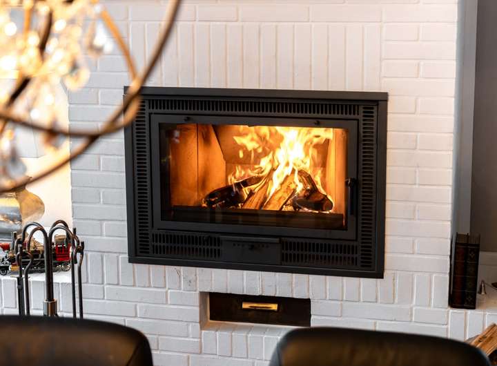 Der zentrale Wohnbereich begeistert mit einer großen Fensterfront zum Garten und einem hochwertig eingelassenen Kaminofen.