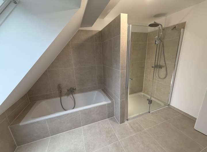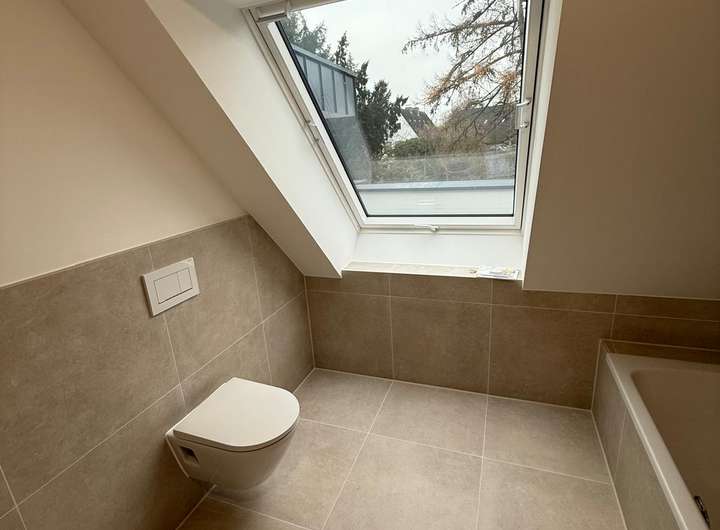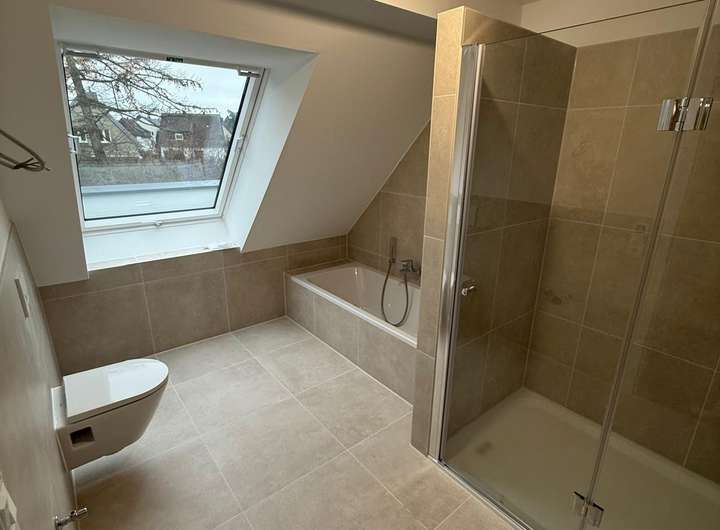 Ausgestattet mit einer großen Regendusche, einer Badewanne sowie dem größten verfügbaren Velux-Energie-Plus-Dachfenster bietet es ein echtes Spa-Gefühl – von der Badewanne mit Blick in den Abendhimmel. Hochwertige, helle cremefarbene Fliesen, Armaturen von HansGrohe und Sanitärobjekte von Duravit unterstreichen den Premiumanspruch. Ein elektrischer Handtuchheizkörper von Zehnder mit Zeitschaltuhr sorgt zu jeder Wunschzeit für angenehm warme Handtücher.