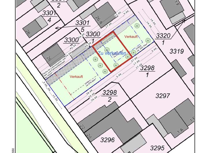 - Flurstück 3299/1 (vorderes Grundstück, straßenseitig): bereits verkauft, mit Bestandsimmobilie