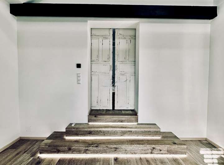 Massivholztreppe mit Parket aus Stahlbeton mit